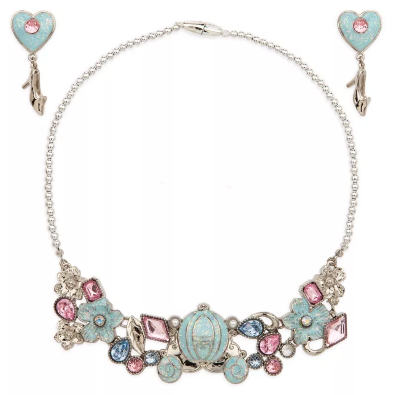 Lend a magic touch to any Cinderella ballgown with this breathtaking jewellery set designed to complement our costume collection. A silvery necklace with pumpkin coach and floral filigree, plus glittering faceted gems, is matched by heart earrings with shining slipper bobs.