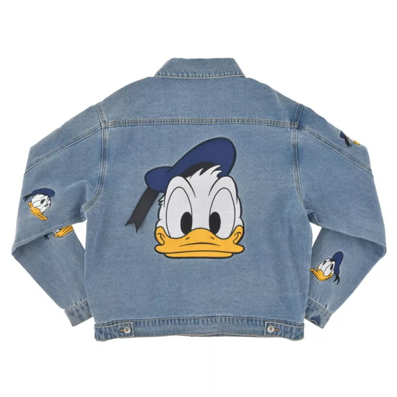 - Various expressions of Donald Duck are featured on the Denim Jacket. Each Donald features his signature black ribbon on the sailor hat