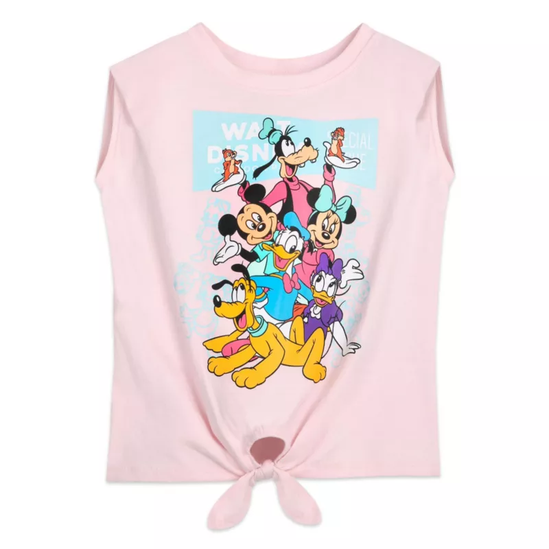Mickey, Minnie all their cartoon pals share a happy greeting with passers-by from the front of this soft jersey tank tee featuring friendly graphics and a tie-up hem.