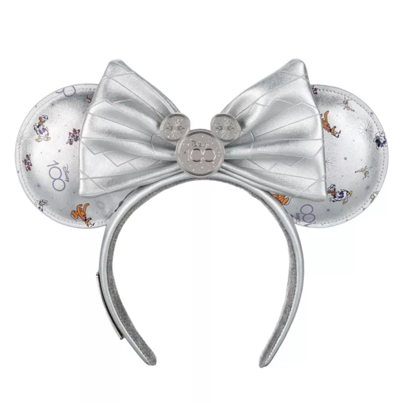 Join Mickey and his many friends in celebrating the Disney100 landmark when wearing this glamorous commemorative ear headband from Loungefly. Minnie, Donald, Daisy and Pluto are among those pictured on the ears of this metallic silver simulated leather headband with its bow featuring a silver Mickey icon brooch with the Disney100 logo.