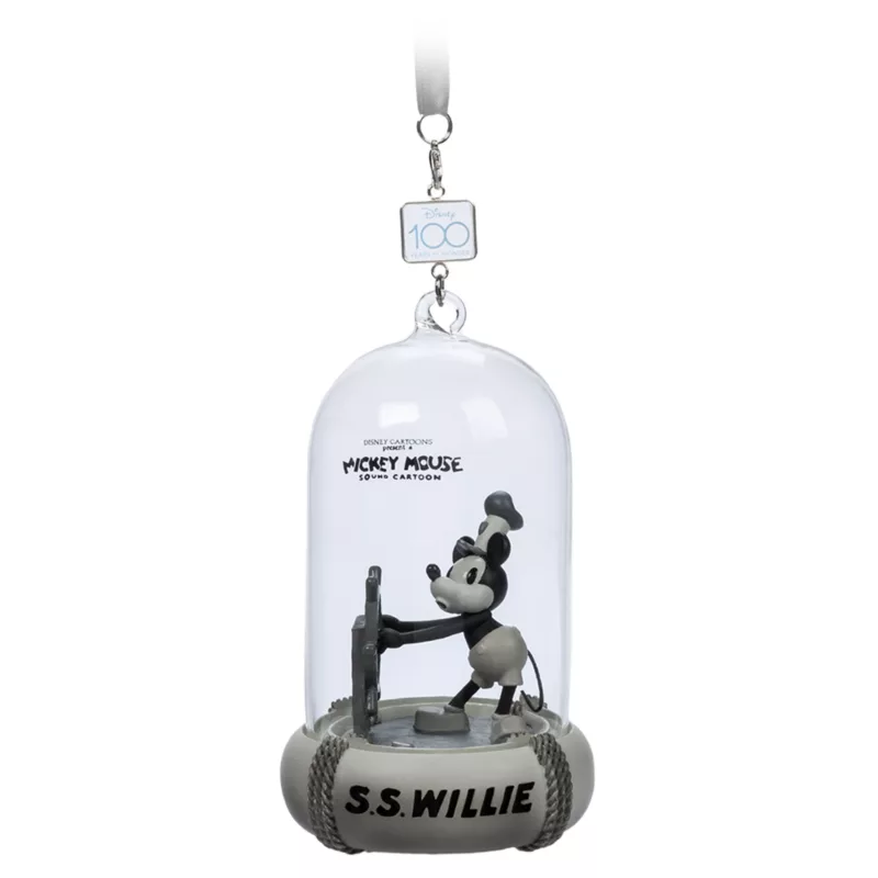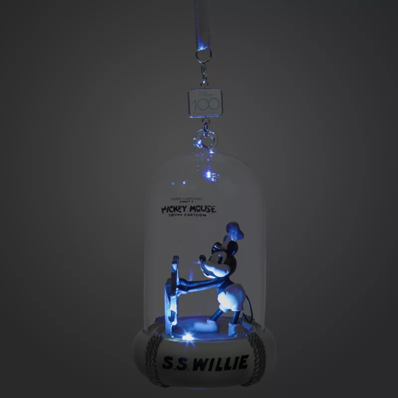 Mickey reprises his debut role as ”Steamboat Willie” for this Living Magic Sketchbook Ornament with lights and whistling sounds. Fully sculpted, Mickey poses at the sternwheel under a clear glass dome.