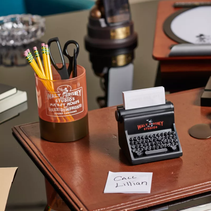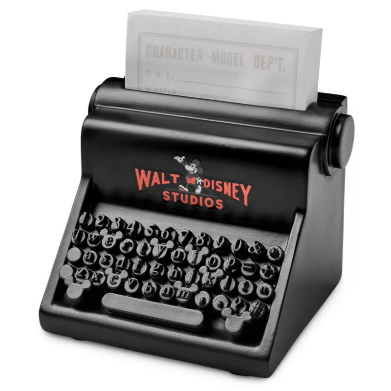 Make your desk a Mouse Factory with this vintage typewriter-shaped sticky note pad holder featuring 1930s Walt Disney Studios logo. Imagine your next animated adventure and make notes or sketches to stick around the office – or maybe just take down messages.