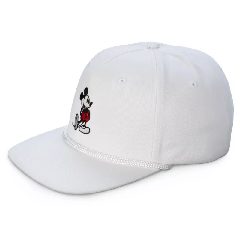 Mickey Mouse’s classic standing pose is embroidered on the front of this baseball cap. The all cotton white design is accented with a cord around the base of the flat bill and the metal buckle on the adjustable back strap insures a perfect fit.