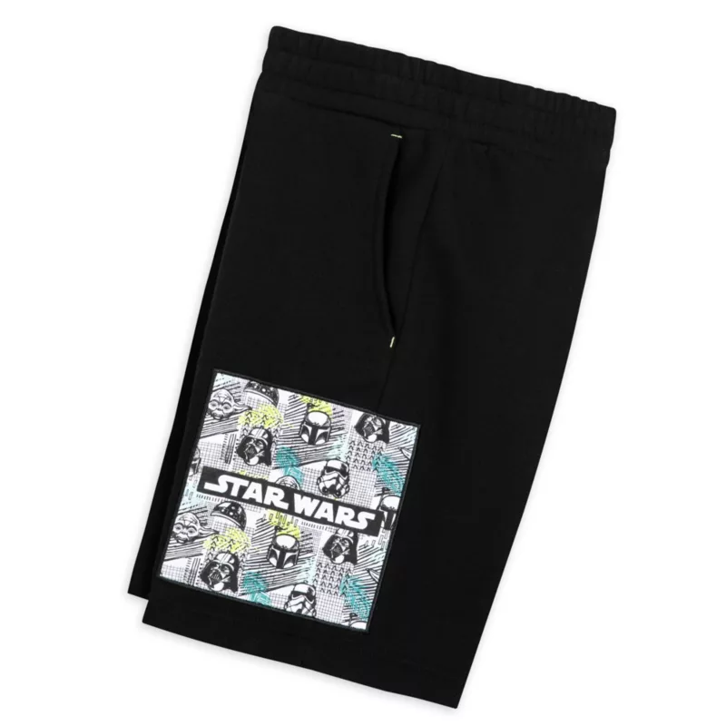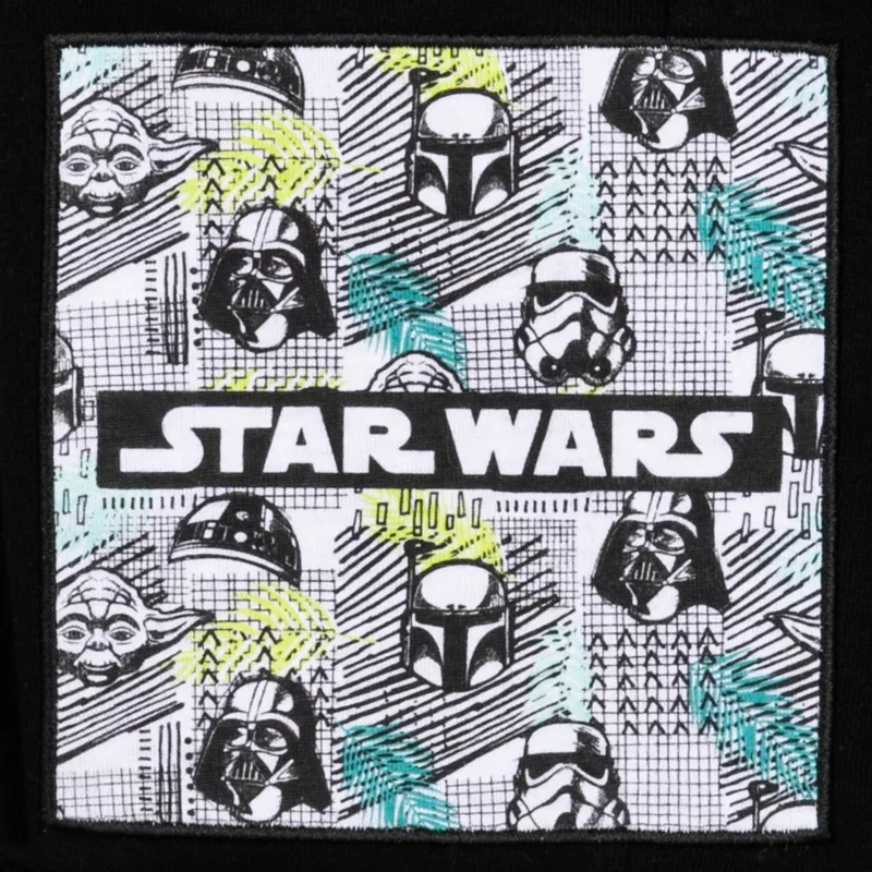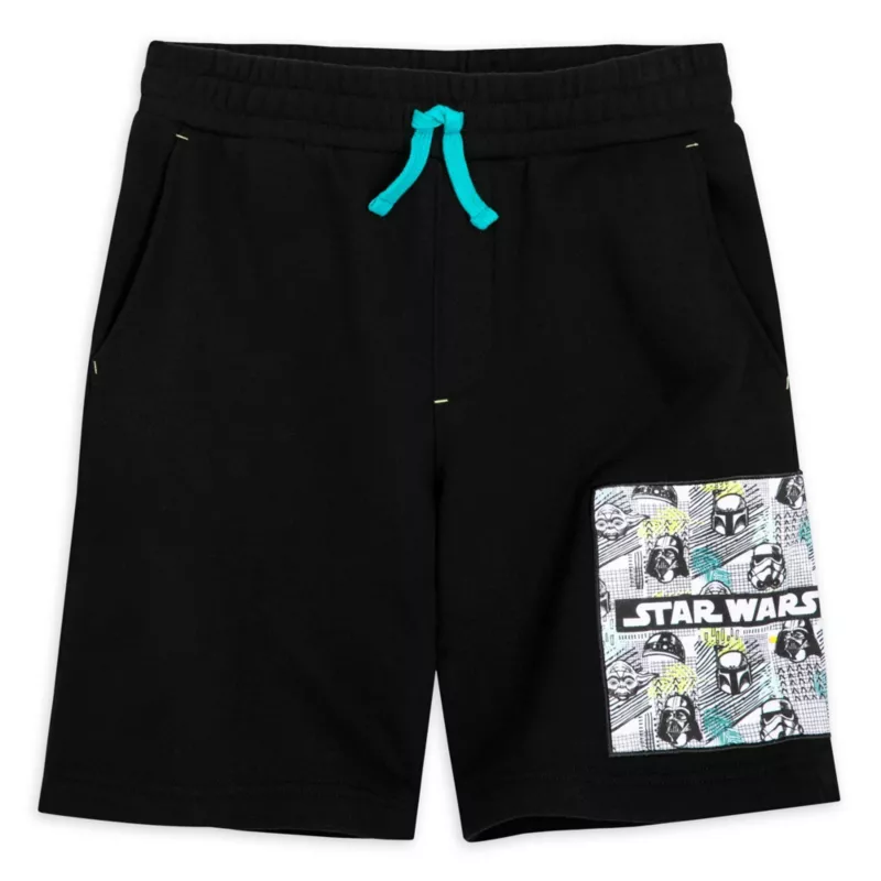 A galaxy of Star Wars characters including Darth Vader, Yoda, and Boba Fett are pictured on the appliqué patch featured on the left leg of these kids’ shorts. The blended fabric of cotton and polyester fleece will be soft and warm while the teal drawstring tie adds a touch of colour to these black shorts that are rather on the dark side.